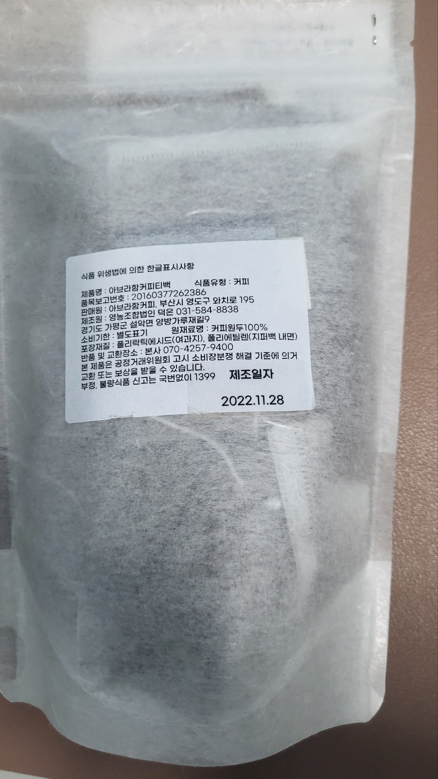 홀빈 형태의 원두를 구매하였고, 집에서 간단히 마시려고 티백 형태도 함께 구매했습니다. 그런데, 티백 형태의 '리틀젠틀맨'이란 제품의 제조년월일이 22년 11월입니다. 오래된 제품 재고털이 하는것 같네요. 이렇게 오래된 제품을 보니까 홀빈 형태의 원두의 제조년월일도 의심이 갑니다. 제가 바리스타 공부를 좀 했기 때문에 커피에 대해서 어느정도는 알고 있었기에 다양한 제품들을 먹어보려고 시도했었는데, 해당 판매 제품의 5개월이 지난 제품을 먹어야 하는것인지요..